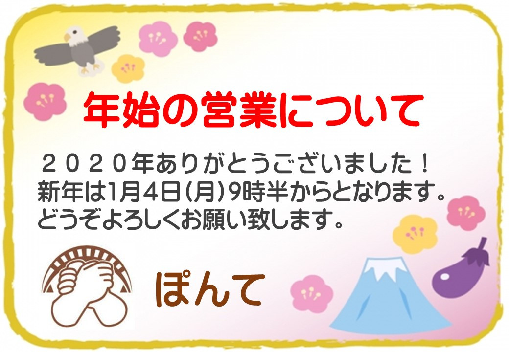 ぽんてアロマサロンの2021年は4日(月)からです! 2020/12/30 せんげん台のぽんてアロマサロン ぽんてアロマサロンの2021年は4日(月)からです! お世話になっております。せんげん台のぽんてアロマサロンの髙橋です。 2020年、ぽんても無事に仕事納めを迎えることが出来ました。 コロナ禍の中、色々な事があった中、こうやって、新年を迎えることができるのは、ひとえに来院して下さった患者さんの寛大なお心と、沢山の方々のご支援によるものです。ありがとうございました。 新年は4日(月)から始まります。 新年も、ぽんては、患者さんに寄り添った形を軸に、ブレずにやって行きたいと思っています。 どうぞ、よろしくお願い致します。 ぽんてアロマサロン 髙橋 お知らせ