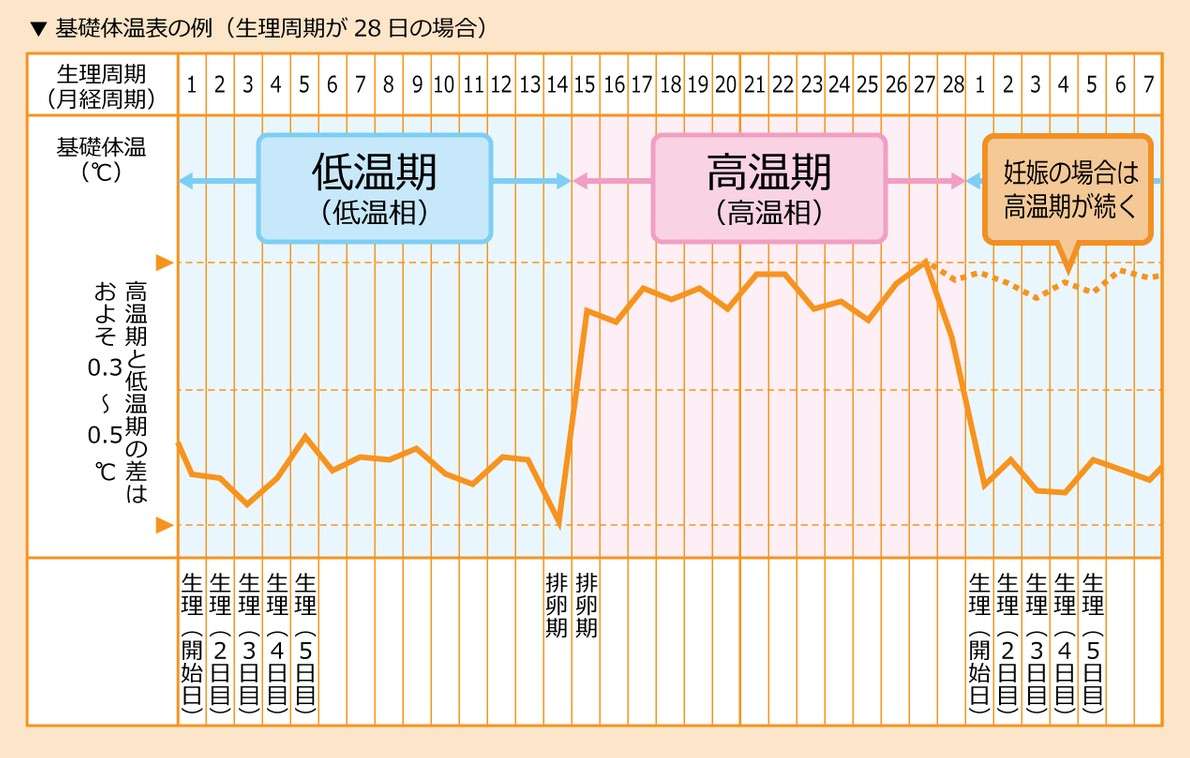 生理が始まってから2週間ほど低温期があり、排卵から次の月経までの2週間ほどが高温期になります。プロゲステロンには体温を上げて受精卵を維持しようとする働きがあるので、排卵とともに体温が上昇するのです。