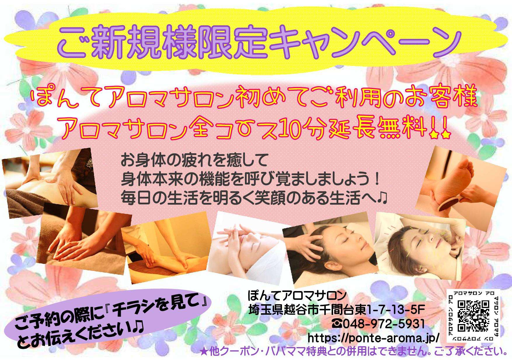 ☆3月の営業時間&キャンペーン☆ 2022/03/14 3月21日(月)も営業しております。 営業時間は9:30~18:00までとなりますのでお気を付けください。 ☆ご新規様キャンペーン実施中☆ 初めてぽんてアロマサロンご利用で全てのコース10分延長!! 時期によってキャンペーン内容が変わっている場合がありますので ご連絡の上ご確認ください。 ご新規様キャンペーン お知らせ