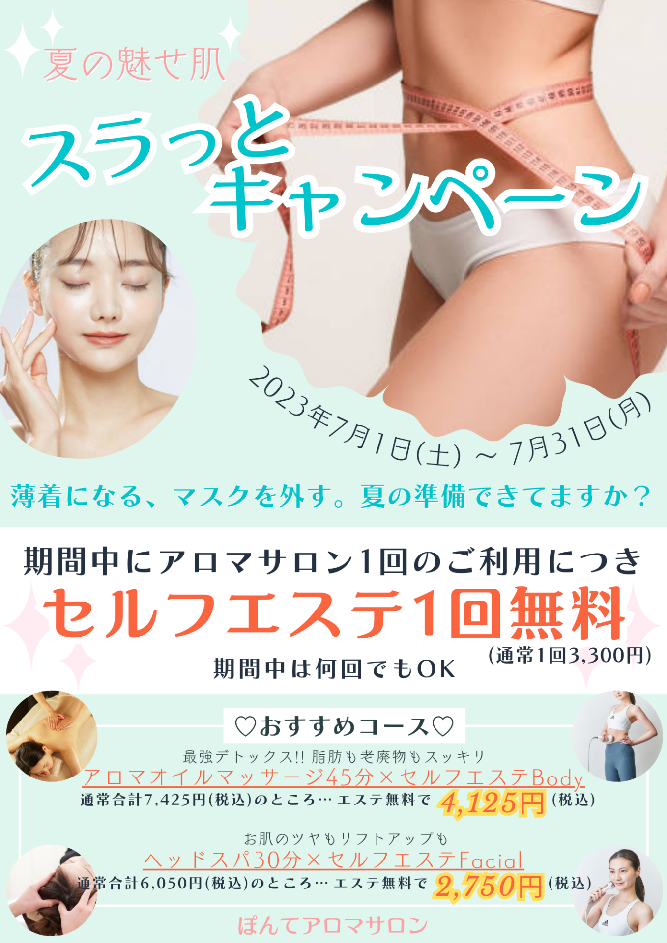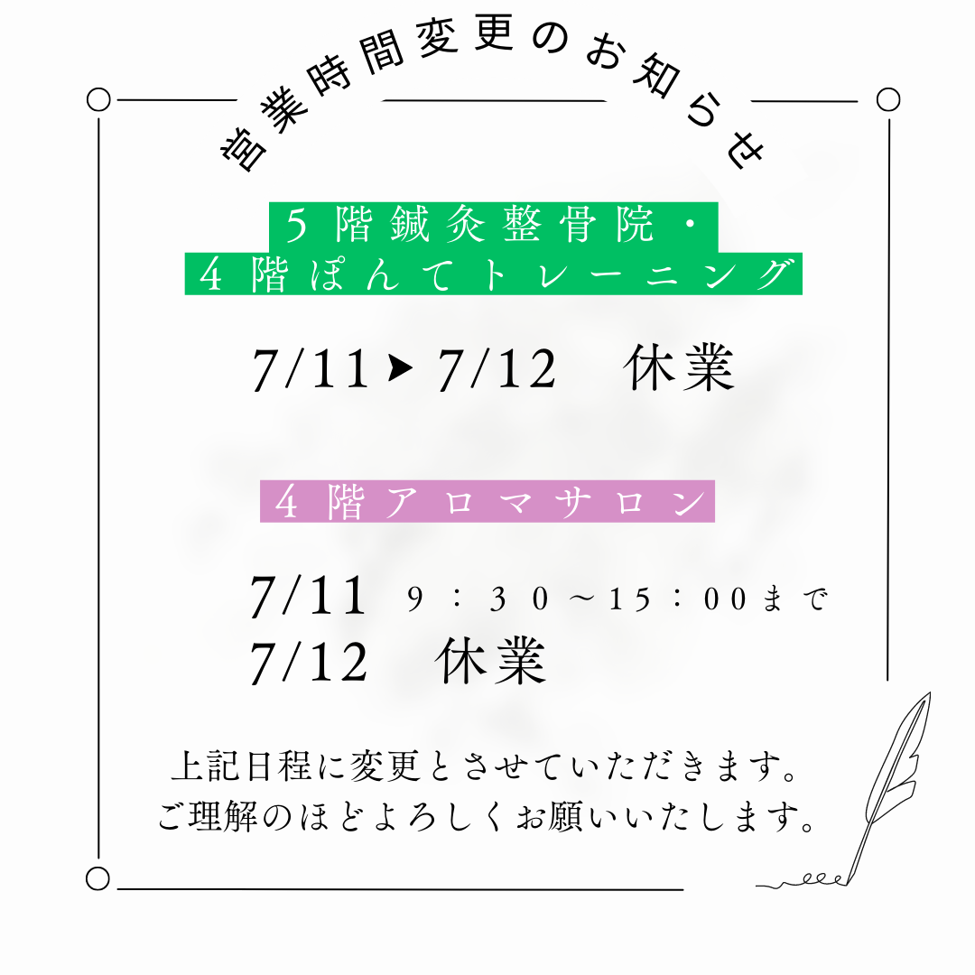 休業日のお知らせ 2023/07/07 せんげん台の整体ぽんて鍼灸整骨院 7月休業日のお知らせ こんにちは!せんげん台駅前の「ぽんてアロマサロン」です。 梅雨はどこへ?というくらい、夏のような暑さの日々ですね💦 夏バテしないよう、よく食べ、よく休息を取り、夏を楽しみましょう♪ 誠に勝手ながら、年末年始は下記の日程で休業させていただきます。 ご不便をおかけしますが、何卒ご理解いただけますと幸いでございます。 鍼灸整骨院・ぽんトレ ⇒ 7/11~7/12 休業 ぽんてアロマサロン ⇒ 7/11 9:30~15:00まで営業 7/12 休業 ぽんてアロマサロンでは、真夏に向けてキャンペーンを実施中♡ 7月中アロマサロン1回のご利用につき、セルフエステが1回無料でできちゃいます! ぽんてアロマサロンのセルフエステは使用するマシンにこだわっています。 プロも使用する先進美容マシンで楽々キレイに✨ ボディラインをスッキリさせたい方、若々しいお顔を目指したい方はぜひ! 初回はしっかりレクチャーするので、この機会にお気軽にお試しください(*^^*) お知らせ