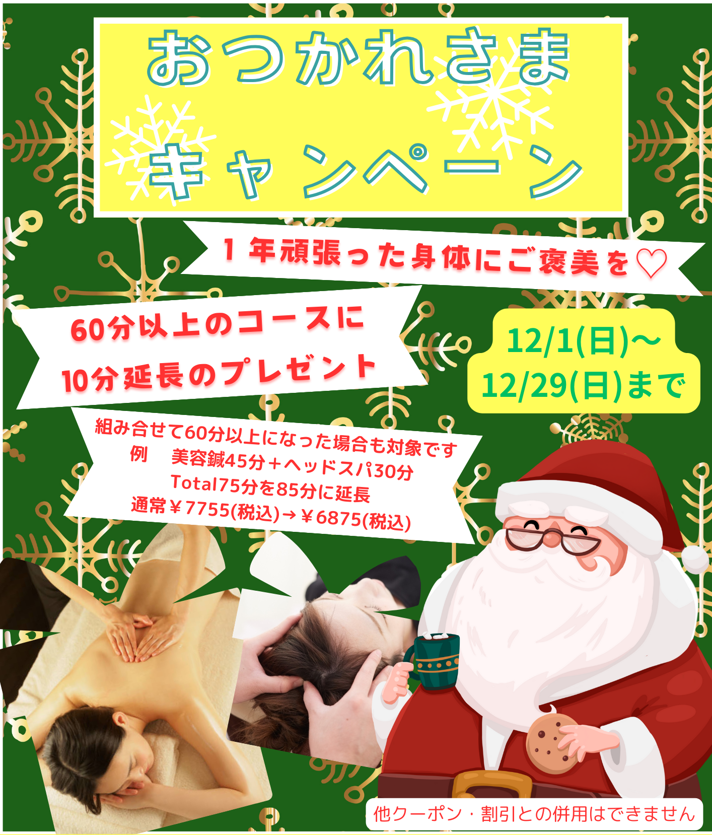 仕事納めや大掃除、家族行事などで疲れが溜まりやすい時期。フェイシャルマッサージは疲労感を和らげ、リフレッシュした表情で年末を迎えられます。